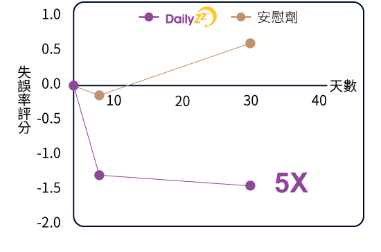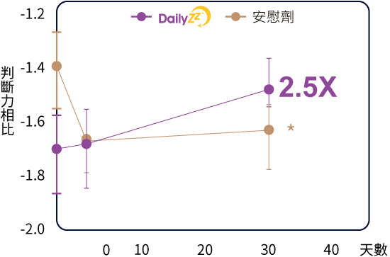 經臨床實證,DailyZz™ 在食用 7 天即明顯有感,持續使用可 2 倍快速明顯改善 2 倍失眠問題及提升 2 倍睡眠品質,睡得飽精神就好,精神好頭腦就靈光,食用 DailyZz™ 後大腦得到充分休息的機會,因此故還能提升 5 倍專注力及 2.5 倍判斷力,日夜兼顧。