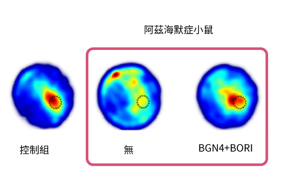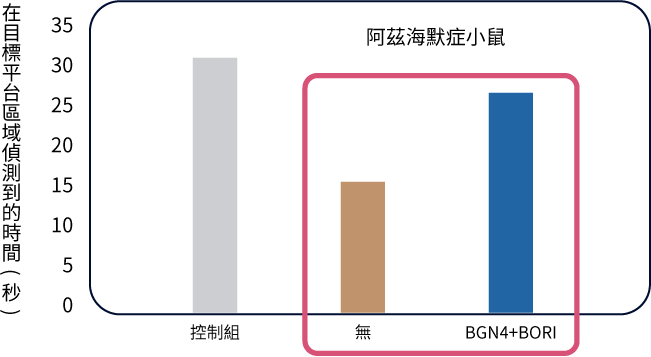 食用 BGN4+BORI 的組別,待在目標平台區域的時間明顯高於未食用的組別,極具改善阿茲海默症之潛力。